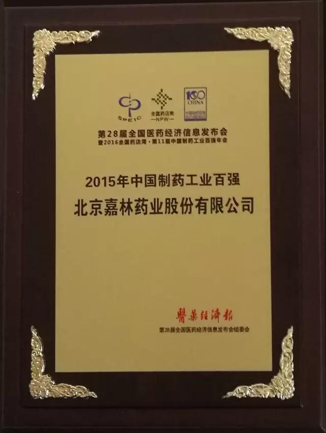 (嘉林藥業(yè)獲得“2015中國制藥工業(yè)百強(qiáng)”榮譽(yù))