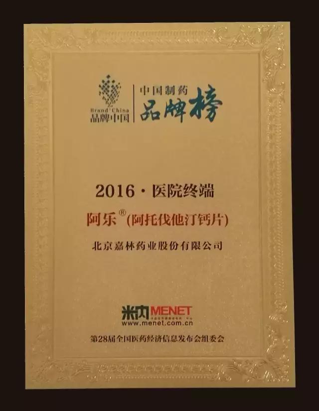 2016年底,在廣州召開的“第28屆全國醫(yī)藥經(jīng)濟(jì)信息發(fā)布會暨2016全國藥店周·第11屆中國制藥工業(yè)百強(qiáng)年會”上,北京嘉林藥業(yè)股份有限公司再次登上“中國制藥工業(yè)百強(qiáng)企業(yè)榜”,嘉林藥業(yè)明星產(chǎn)品心腦血管調(diào)脂藥物阿樂(阿托伐他汀鈣片)榮獲“中國制藥?醫(yī)院終端品牌”。